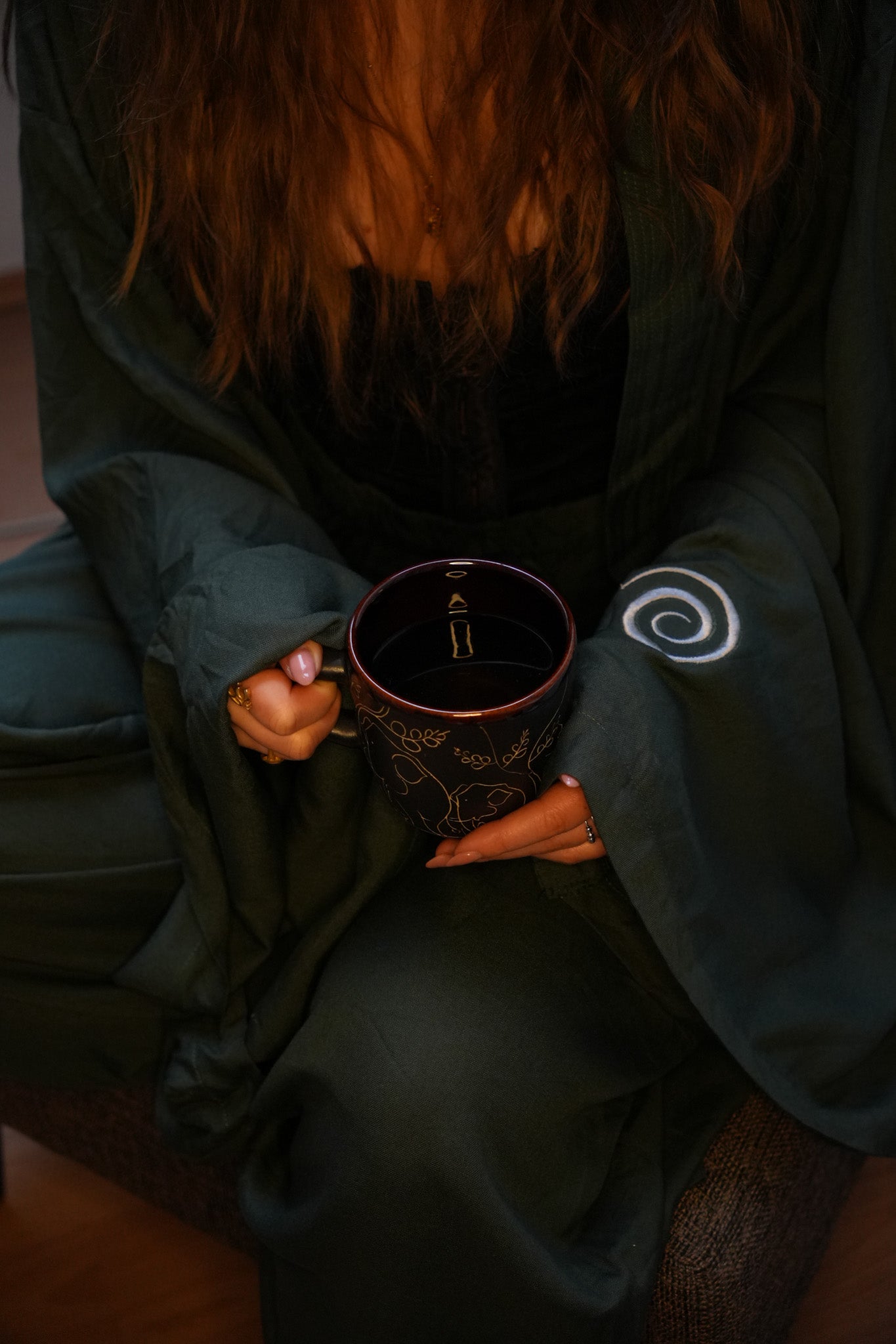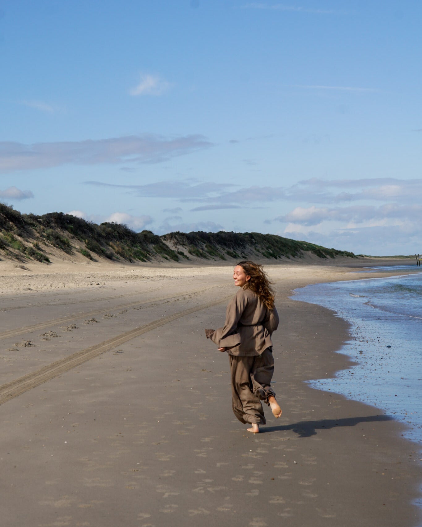 Die weiten Beine schenken Bewegungsfreiheit – perfekt zum Barfußtanzen, für Yoga oder ruhige Momente der Einkehr. Eine feine Spirale ist auf dem Bein eingestickt – Symbol für den inneren Fluss und für Wachstum von innen heraus.